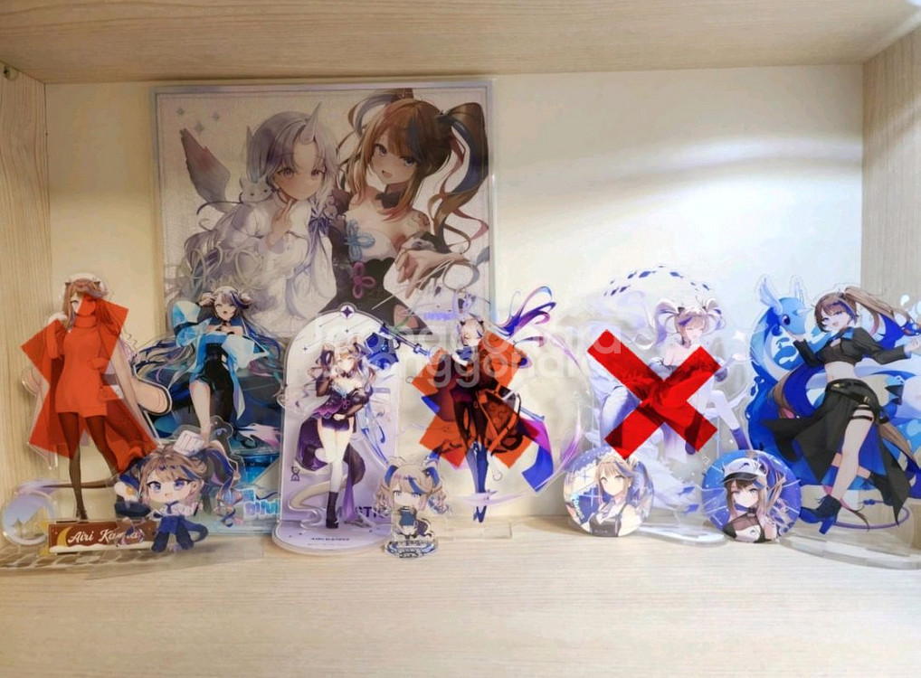 아이리 칸나 굿즈입니다 아크릴 개당 2.5 캔뱃지 개당 0.7 미니 아크릴 개당 1.2 칸나 유니 그림 3.0 x되어 있는 아크릴은 팔렸습니다 사고 잠깐 전시 했다가 계속 보관중이라 상태 좋습니다