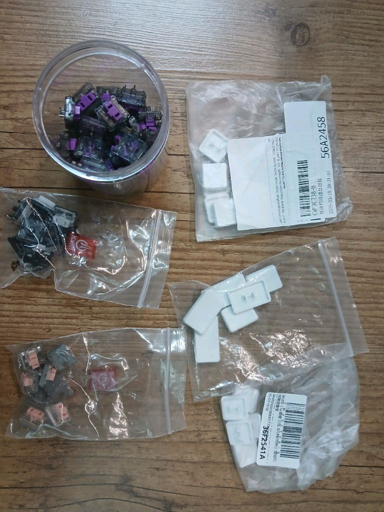 kailh Low Profile 핑크축8, 보라축 51, 흰색(클릭) 10 초콜릿 키캡과 cfx 키캡 1.25u, 1.5u 각 2개씩 있습니다. 사진 참고 모두 일괄 금액입니다.