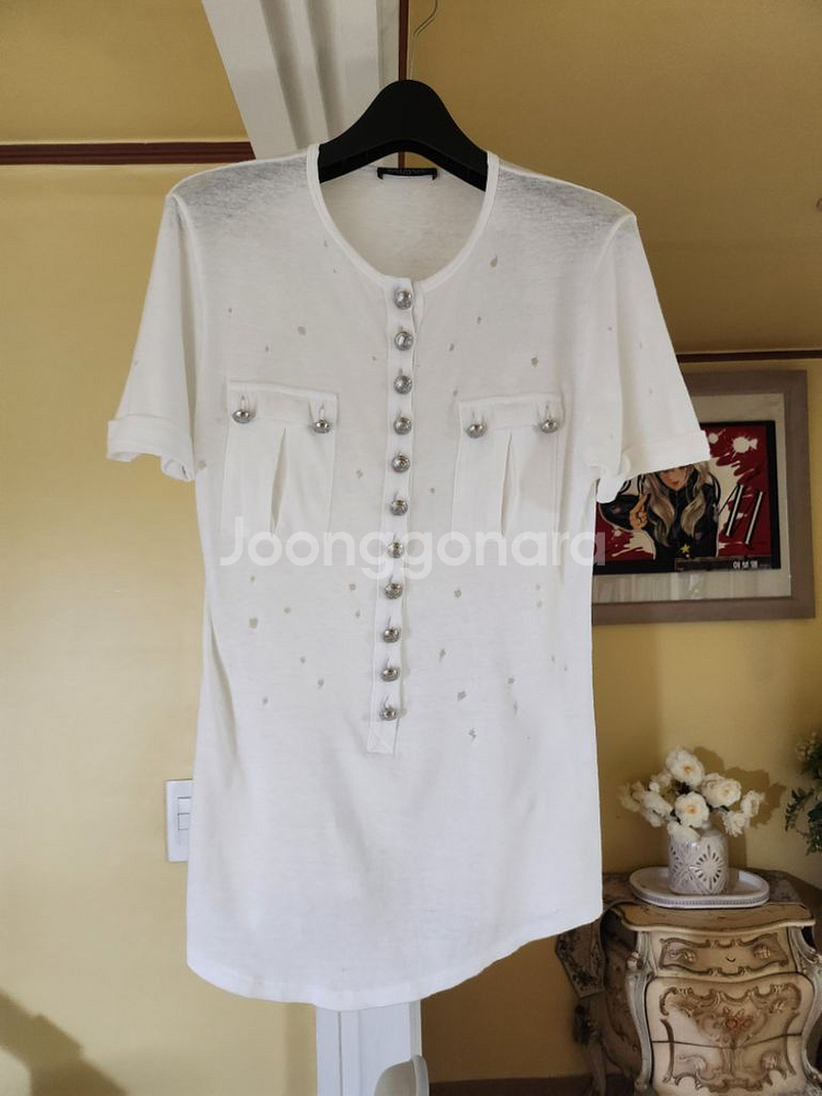 발망 화이트 버튼 장식 티셔츠입니다 사이즈는 38이고, 소재는 면 70%, 린넨 30%입니다 - 독특한 버튼 디테일이 포인트! - 편하게 입기 좋아요 발망은 고급스러운 단추가 포인트인데요 반짝임상태가 아주좋아요 오염도없고 상태좋으나 등쪽 작은구멍있는데 이게 몸판전체에 빈티지스타일이라 구멍있는제품이라 티가 전혀나진않아요 저렴히판매합니다