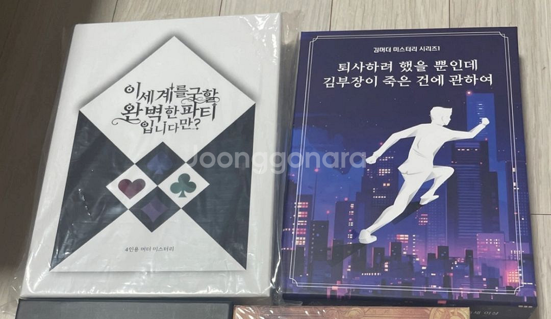 4인용 미스터리 보드게임 판매합니다 (모두 1회플) 모두 펀딩판 - 세계를 구할 완벽한 파티입니다 - 퇴사하려 했을 뿐인데 김부장이 죽은 건에 관하여 - 베르단디 시리즈 3개 (운명의 세 여신) - 살인 라이브 - 파랑새 * 퇴사는 4-5인이지만 4인 추천이라 같이 넣었습니다(5인 비추천) 택배는 일택 / 반택 (cu만) : 택비별도