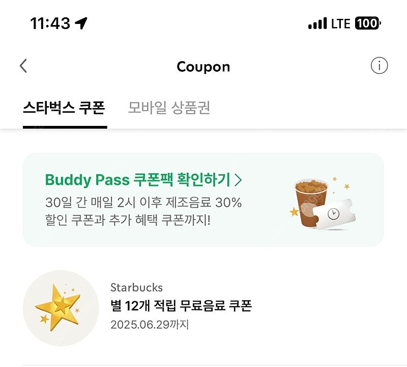 📢 제목에 "제조사/ 브랜드 명"과 "티켓명(ex. 스타벅스 아메리카노 Tall) ”을 넣어 작성하면, 보다 빠른 판매가 가능합니다! 📢 게시글 작성 시 배송 방법에 “직거래”와 “내 위치” 설정할 경우, 보다 빠른 판매가 가능합니다! 📢 내가 가진 커피, 편의점 e쿠폰을 <J쿠폰>에서 간편하고 빠르게 판매가 가능합니다! 2일 이내 판매금을 정산 받아보세요. 별 12개 적립 무료음료 쿠폰과 프리퀀시 일반 3개 혹은 미션 2개와 교환 합니다 선물하기로 보내드립니다 2025.06.29까지 사용 가능 🚨회원님의 거래 게시글을 노린 중고나라 운영진 사칭 피싱 사이트를 주의하세요🚨