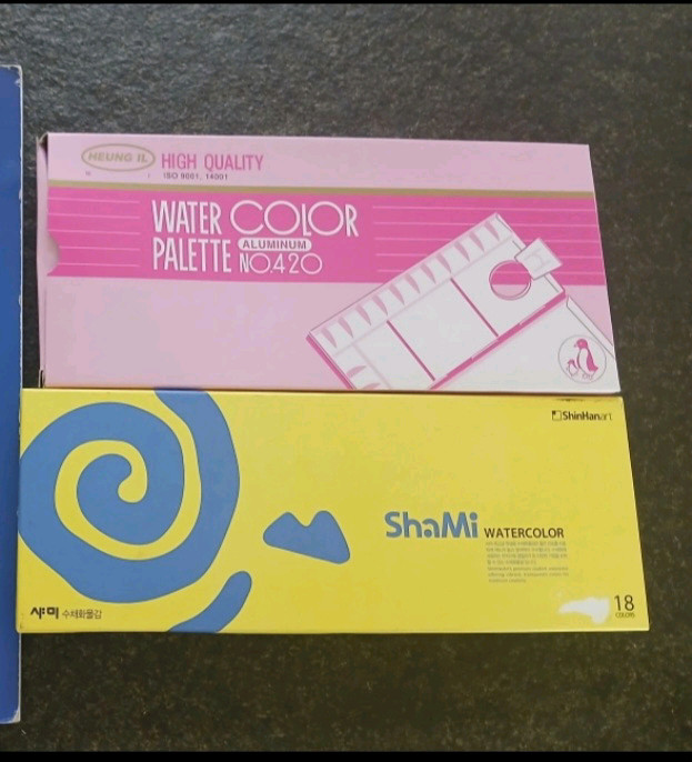 아이가 미술학원 1달밖에 다니지않아서ᆢ 몆번 사용못했어요ㅜㅜ 샤미수채화물감,화홍붓,흥일 파레트3종 전문가용이라ᆢ총가격4마넌대 정도구입했어요~ 미술학원초반에 꼭 필요한 구성품입니다~ 🏪편의점 반값택배 가능해요~