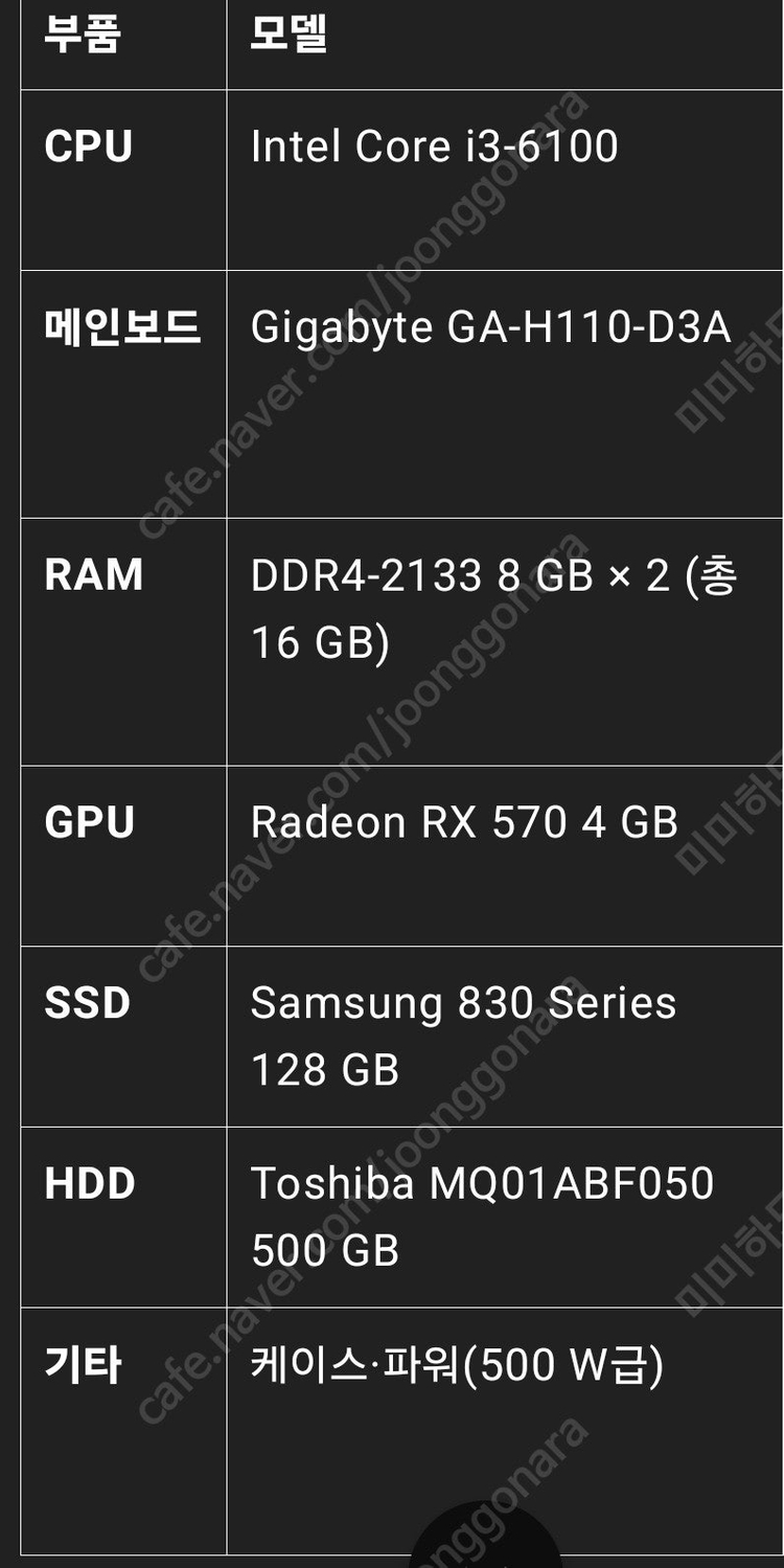 FHD 롤·오버워치2 중옵 100fps, 로아·피온4 국민옵 이상 돌리는 사무·게임용 본체입니다. 전 디아2 래저렉션용으로 썼어요.인텔 i3-6100+RX570 4GB+DDR4 16GB+삼성 SSD 128GB+Toshiba 500GB HDD, H110 보드. 소음·온도 정상. 윈도우는 포맷하고 시리얼키 없는 상태로 깔아놔드릴께요. 오늘 안에 구매 시 17 만원에 드려요. 압구정역에서 직거래 하고요, 서울 전역·경기 동부까지 배송 가능해요 배송비는 3만원입니다