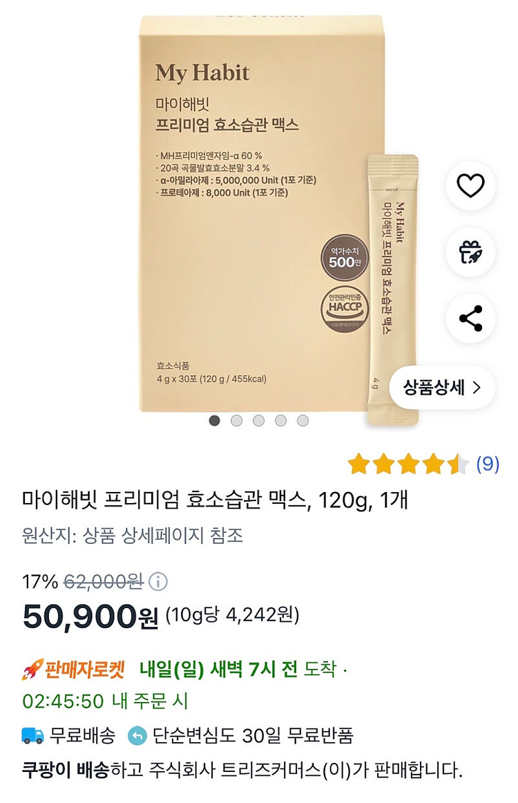 마이해빗 프리미엄 효소습관 맥스 판매합니다. 곡물맛이 입자도 곱고 고소하고 먹기 좋습니다. 마이해빗 효소는 워낙 유명하고, 기존 효소에서 억가수치가 5배로 업그레이 된 프리미엄 효소입니다. 너무 많이 구입해 정리합니다. 현재 통당 5만원정도에 판매중인데 3만원에 판매합니다. 3만원 소비기한 2027. 02. 07