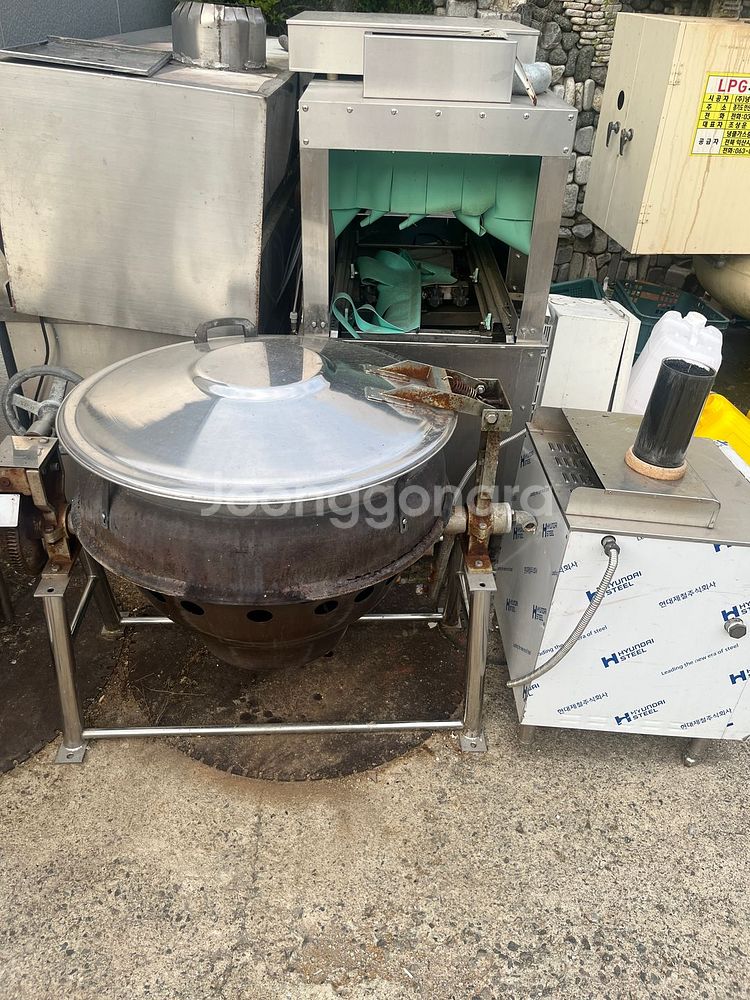 대량 조리 시 사용할 수 있는 가마솥입니다. 메인 반찬(제육볶음, 불고기 등) 조리용으로 이용했습니다. 가게 확장 공사를 하며 더 큰 조리 기구를 구매하게 되어 판매합니다. 가스 연결하고 사용하시면 됩니다.