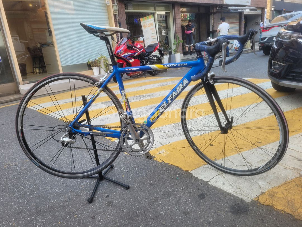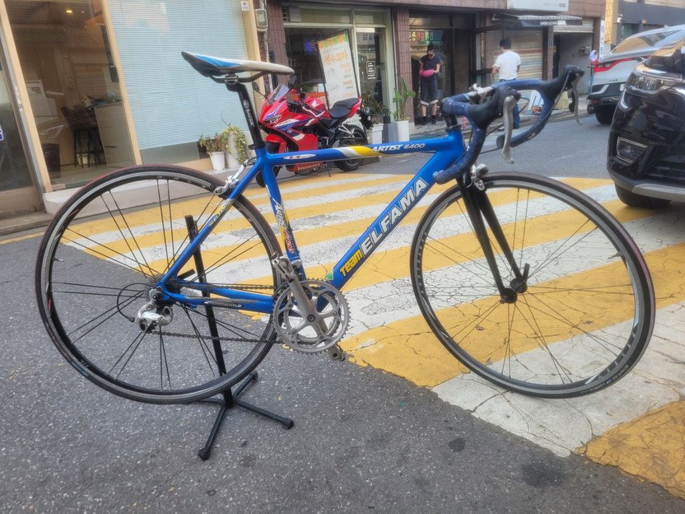 "TEAM ELFA Artist 6400 로드 자전거 팝니다. 2000년대 초반 모델로 추정되며, 알루미늄 프레임과 카본 포크를 사용했습니다. 20단 구형 Shimano 105 구동계이며, 기능상 문제는 없습니다. 스템과 핸들바는 Easton 제품이며, 휠은 Bontrager 휠로 업그레이드 되어 있습니다. 연식이 있다 보니 녹이 슨 부분이 있으니 감안해주세요. 입문용 로드 자전거로 추천드립니다. 빈티지 로드 자전거 팝니다 ~~ ! !25만원 ㅍㅍ