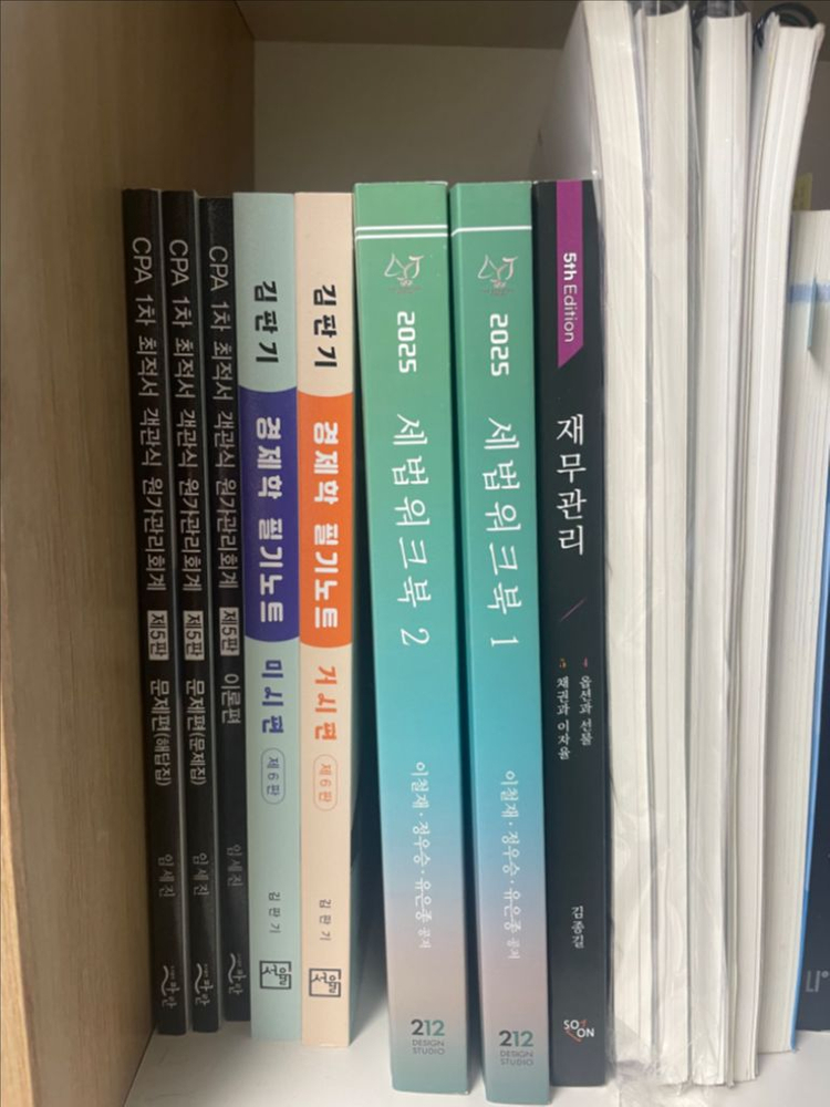 . - 2차 시험 답안지 3권 (새 상품) : 5,000 - 세법 워크북 정우승 2025 1권 (새 상품) : 17,000 - 세법 워크북 정우승 2025 2권 (새 상품) : 17,000 - 재무관리 김종길 2025 파트 1, 2 (앞부분 필기) : 5,000 - 재무관리 김종길 2025 파트 3 (새 상품) : 17,000 - 재무관리 김종길 2025 파트 4, 5 (새 상품) : 17,000 - 재무관리 김종길 2025 필기노트 (앞부분 필기) : 10,000 - 원가관리회계 임세진 객관식 교재 전3권 (새 상품) : 27,000 - 경제학 필기노트 거시편 김판기 2025 (새 상품) : 12,000 - 경제학 필기노트 미시편 김판기 2025 (새 상품) : 12,000 여러개 구매하시면 가격 네고해드릴게요!! 한 권씩도 구매 가능합니당 편하게 연락 주세여!!