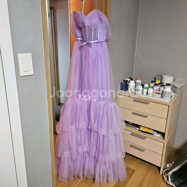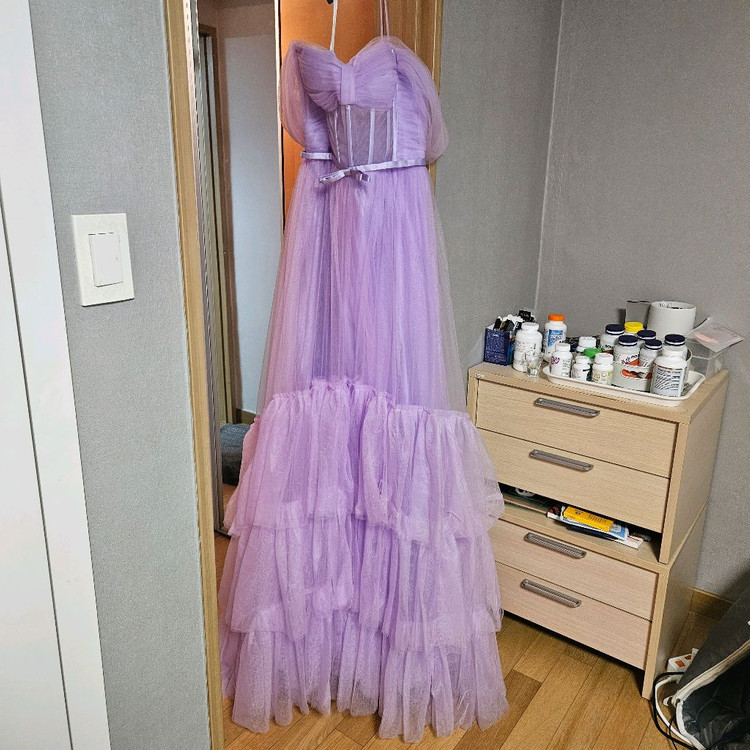 웨딩드레스 대여샵에서 샘플세일때 구매했어요! 오프숄더 형태라 팔뚝살도 가려주고 이뻐요 그리고 배? 부분이 살짝 시스루입니다! 2부드레스로 넘 이뻐용! 55-66사이즈에요!