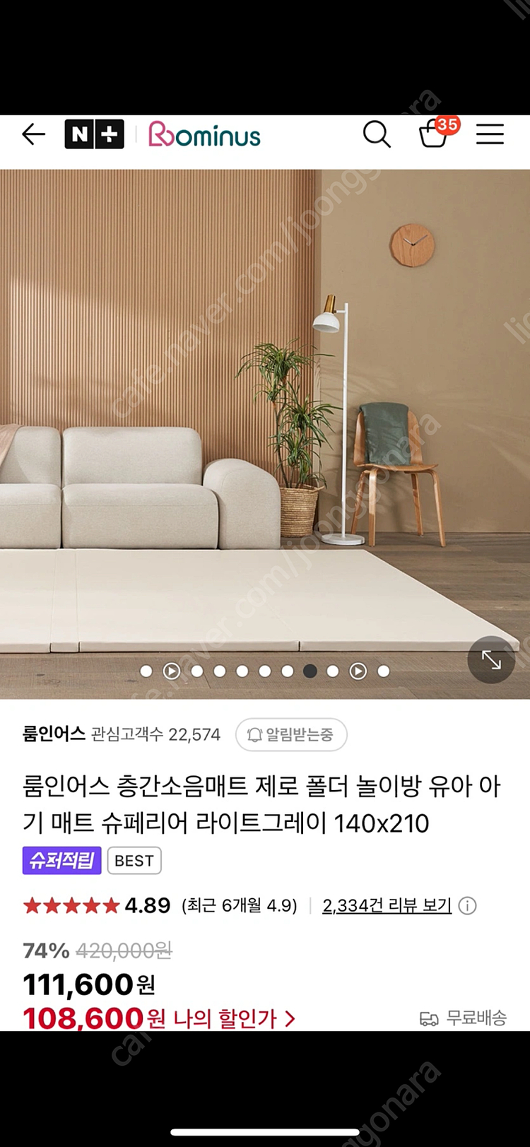 📢 제목에 "제조사/ 브랜드 명"과 "상품명”를 넣어 작성하면, 보다 빠른 판매가 가능합니다! 📢 게시글 작성 시 배송 방법에 “직거래”와 “내 위치” 설정할 경우, 보다 빠른 판매가 가능합니다! 24년에 구입한 층간소음 매트입니다. 아이가 커서 사용하지 않아 판매합니다. 상태 좋습니다. 부피가 커서 직거래 가능합니다. 제품설명은 아래와 같습니다. https://m.brand.naver.com/roominus/products/6989131840 🚨회원님의 거래 게시글을 노린 중고나라 운영진 사칭 피싱 사이트를 주의하세요🚨