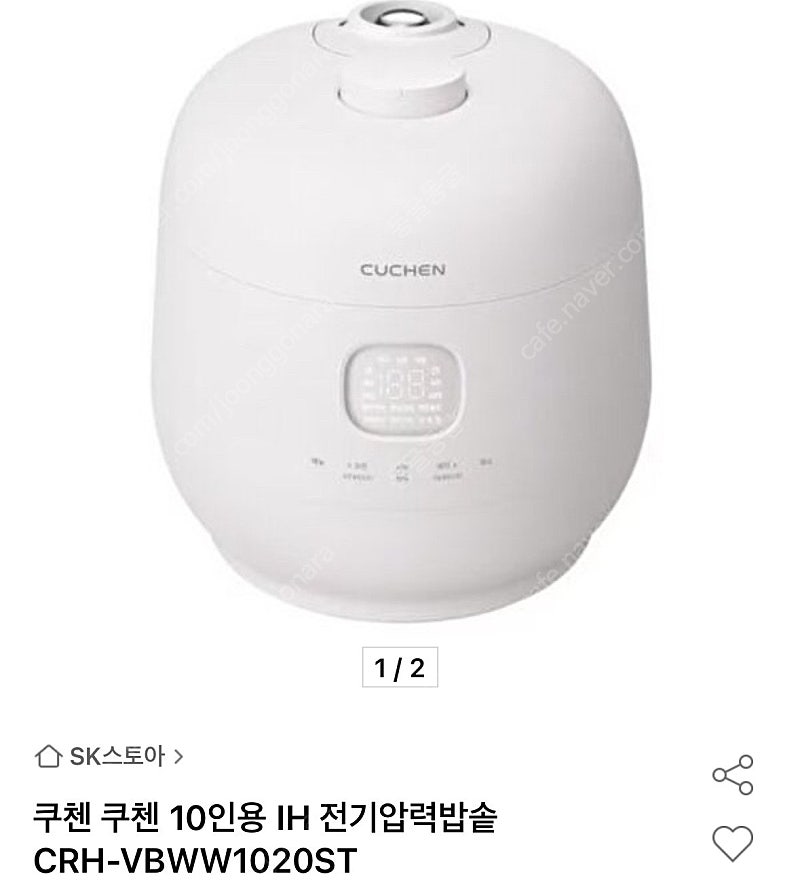 📢 제목에 "제조사/ 브랜드 명"과 "상품명(ex. 3000시리즈 전동 면도기)”을 넣어 작성하면, 보다 빠른 판매가 가능합니다! 📢 게시글 작성 시 배송 방법에 “직거래”와 “내 위치” 설정할 경우, 보다 빠른 판매가 가능합니다! ★★개봉도 안한 선물받은 새제품입니다★★ 쿠첸 10인용 IH 전기압력밥솥 새상품입니다. (포장도 안뜯은 선물받은 제품) 모델명은 CRH-VBWW1020ST 이구요 - 10인용 IH압력밥솥 - 풀스테인리스 - 스마트 밥맛 기능 - 자동세척 기능 - 에너지아이 기능 네이버 최저가는 302,730원이에요 박스도 있어요! *** **** **** 🚨회원님의 거래 게시글을 노린 중고나라 운영진 사칭 피싱 사이트를 주의하세요🚨상품 정보 내 개인정보는 자동 보호됩니다. 안심결제로 안전하게 거래하세요.