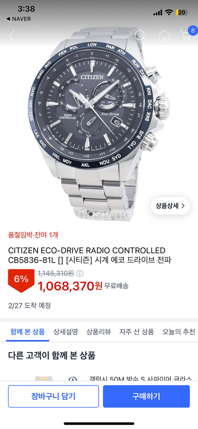 📍 시티즌 CITIZEN CB5836-81L 에코드라이브 라디오컨트롤 정가 114만 → 95만원에 판매합니다. ✅ 정품 / 새상품급 상태 ✅ 구성품: 시계 본품 + 박스 + 보증서 포함 ✅ 기능: 전파수신 / 월드타임 / 크로노그래프 / 에코드라이브(충전식 배터리) ✅ 생활방수, 스테인리스 밴드, 다이얼 스크래치 없음 ✅ 실착 1~2회, 보관만 했습니다 💬직거래(서울) or 택배거래 가능! 관심 있으신 분 연락주세요! 선물용으로 구매 했는데 사용안한다고 해서 판매 합니다🙇🏽♀️