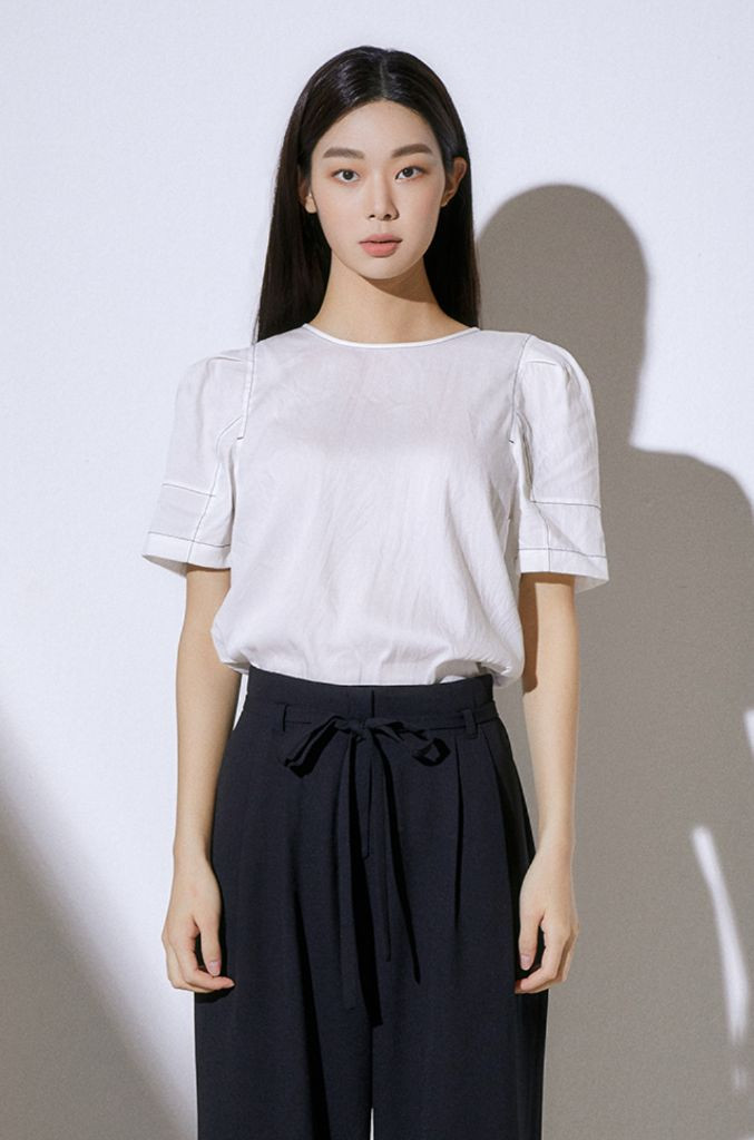 미쏘 스티치 퍼프소매 블라우스 브라운