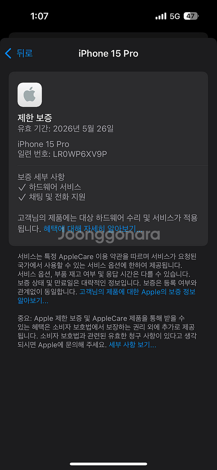 ※100% 실사이며 허위매물을 판매하지 않습니다 아이폰15프로 화이트티타늄색상 256용량 판매합니다 최초사용일 25년 5월로 보증기간 26년 5월 26일까지 남아있습니다 선택약정 할인 및 확정기변 가능한 공기계 입니다 3사 모든통신사,알뜰폰 유심꼽고 바로 사용가능하세요 배터리성능 100%이며 배터리 컨디션 최상입니다 액정화면 파손 및 잔상 없는 단말기 입니다 관 사진과 동일 흠집 기스 일절 없는 초S급 신폰급 컨디션 유지 중 입니다 해외판 단말기로 카메라 셔터음 무음 / 물리유심 사용 불가입니다 배터리 광탈 현상 없고 , 사설수리 이력 없습니다 모든기능 확인후 초기화 해뒀으며 사용하시던 유심 넣고 바로 사용 가능하세요 구매시 필름 부착해드리며 미사용 케이스 챙겨드려요 @단순변심 제외 기능불량시 7일이내 교환환불 가능합니다@ 가산디지털단지역 직거래 혹은 택배거래 가능 합니다 댓글,채팅 확인어려워요 (문자나 전화 부탁드립니다) *** **** ****상품 정보 내 개인정보는 자동 보호됩니다. 안심결제로 안전하게 거래하세요.