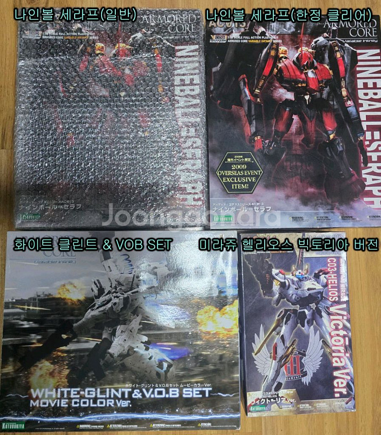 고토부키야 아머드코어(나인볼 한정판,화이트 글린트,미라쥬) 미개봉 직거래 1. 나인볼 세라프 일반버전 : 7만원 판매완료 2. 나인볼 세라프 한정판(클리어버전) : 12만원 3. 화이트 글린트 & VOB SET: 10만원 4. 미라쥬 헬리오스 빅토리아 버전 : 5만원 모두 고토부키야 정품 미개봉입니다. 사진에 보이는 제품 그대로고 박스는 깨끗하지만 그래도 세월은 좀 느껴집니다. 일산 현산초등학교 정문앞이나 현산초등학교앞 CU편의점에서 직거래 합니다. 직거래니까 부담없이 오셔서 직접 보시고 구입하세요~ 보시고 상태가 별로다 하시면 구매거부하셔도 좋습니다! 그만큼 상태에 자신있습니다. 전화나 문자주세요!