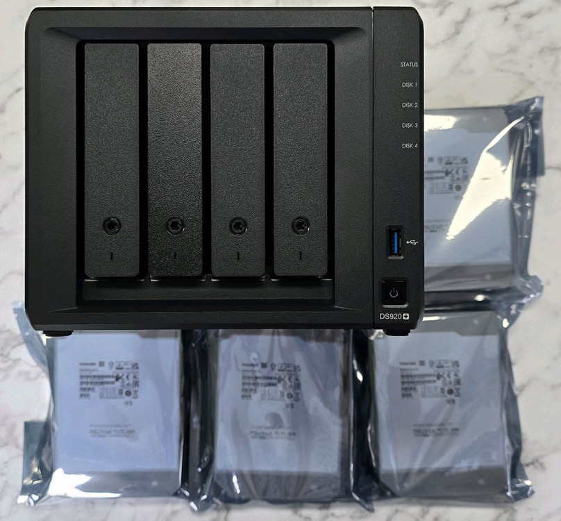 시놀로지 DS920+ NAS 판매합니다. 8GB 로 메모리 업그레이드 되어 있습니다 씨게이트 엑소스 12테라 4개 총 48테라 포함 입니다. - 4베이 NAS - 쿼드 코어 CPU - 8GB DDR4 메모리 - M.2 NVMe SSD 슬롯 2개 - 기가비트 이더넷 포트 2개 - USB 3.0 포트 2개 - eSATA 포트 1개 잘 작동 하고 깨끗합니다. 프랭크버거 숙대점 앞에서 직거래 합니다. 택배 가능합니다.