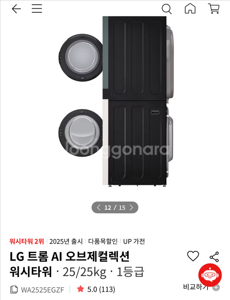 LG 트롬 워시타워 오브제컬렉션 팝니다. 새 상품입니다. - 모델명: WA2525EGZF - 폭 700mm, 깊이 830mm(도어 오픈 1,410mm), 높이1,890mm - 색상: 건조기(그린), 세탁기(베이지) - AI 맞춤세탁 기능 - 스마트 건조 기능 - 트루스팀 기능 - DD모터, 6모션 - ThinQ 앱 연동 - 에너지효율 1등급 - 배송, 설치 무료 - 거래 확정 후 일주일 정도 소요 - 대전 전지역 거래가능