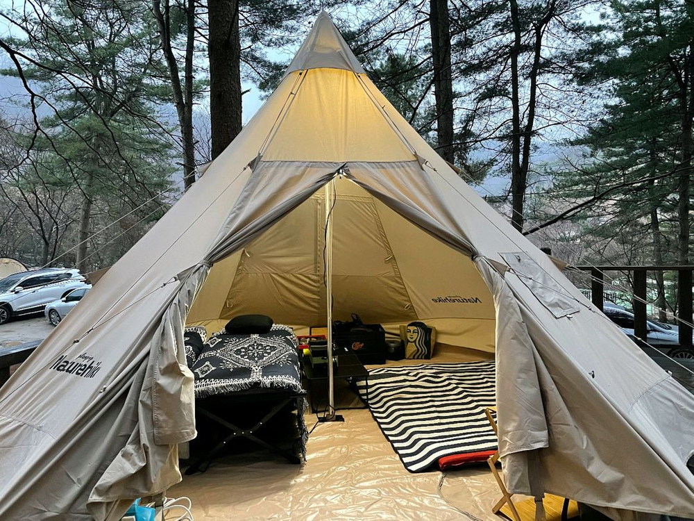 Naturehike 티피 텐트입니다. 구매할때 해외배송으로 80만원 정도에 샀었습니다. 실사용 횟수는 3회 정도입니다. 캠핑 분위기 내기에 딱 좋아요! - 설치가 간편하고 통기성이 좋아요 - 넓은 내부 공간 - 면 혼방 소재로 쾌적합니다 -겨울에도 매우 따뜻합니다