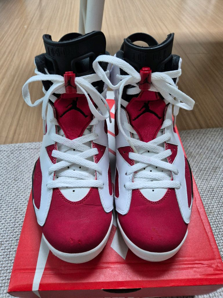 나이키 조던6 카마인 2014년 슈구 발라서 신었고 많이 신지않아 상태좋아요. 앞코에 사진처럼 약간 까짐 있으나, 매우 깨끗한 편입니다. 세탁 깨끗이 해둔 상태며 연식 대비 매우 좋아 실착용으로는 매우 추천합니다 밑창 오염처럼 보이는 건 슈구흔적이라 열심히 떼면 떨어집니다. 박스는 다른 신발박스입니다. 네고답장 없습니다.
