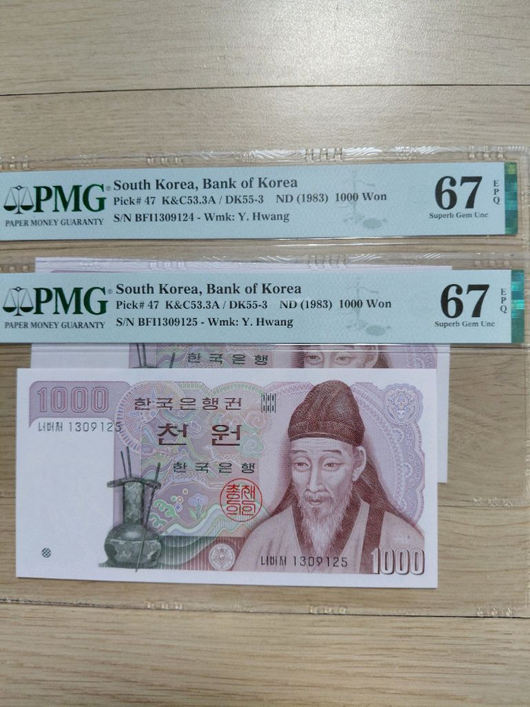 옛날돈미사용 1983년천원지폐 연결 PMG 67등급 2 연결 우체국 택배