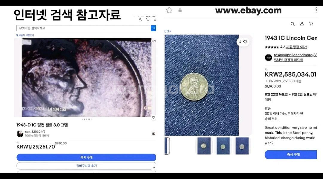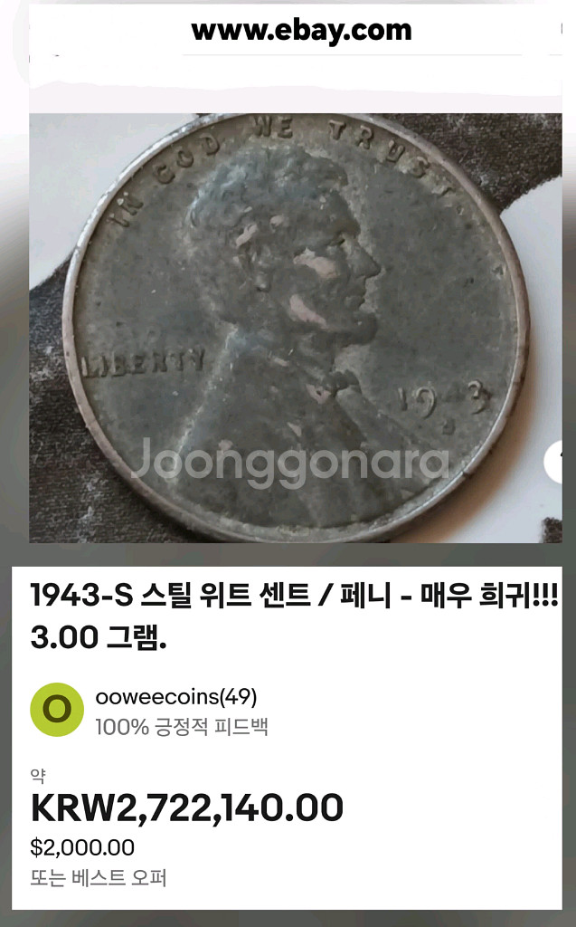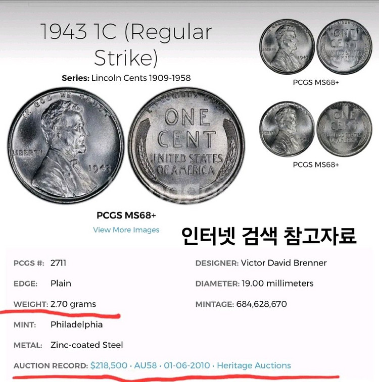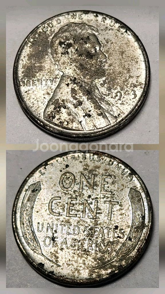 미국주화 링컨 밀(위트) 스틸페니 WAR 1943 - 3.1그램 1943 구리페니는 20만불 이상임 - 스틸 페니의 정상 무게는 2.7 gram입니다. * 미사용 주화입니다. 현지 경매로 수집 - 허용 오차는 0.13 gram 입니다. 2.83그램 - 미국주화 페니는 단 1회 스틸페니 발행함 - 노 민트마크는 필라델피아 조폐국입니다. - 자석에는 반응합니다. 달라붙습니다. - 3.0 그램 스틸페니는 매우 희귀합니다. - 20여년 전에 미국의 현지 시장경매 통해서 수집한 희귀 주화입니다.(사진 참조하세요) * 사진은 실물사진입니다. * 택배비는 별도입니다.