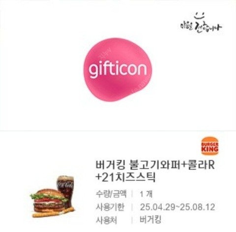버거킹 와퍼+콜라R+21치즈스틱 정가: 11,800원 판매가 : 7,500원 (35% 할인, 네고 불가) 유효기간 : 2025.08.12 까지 (연장 불가, 환불 불가) 수량 : 1장 매장 방문 사용만 가능합니다. 메뉴 변경 불가능합니다. 현금영수증 발행 가능합니다. (구매금액과 다를 수 있음) 사용 불가매장 인천공항T2교통센터점, 인천공항1교통센터점, 오션월드점, 대명비발디점, 거제고현점, 거제옥포점, 경남대점, 경주보문점, 광양LF스퀘어점, 광양중동점, 광주일 곡점, 광주첨단2지구점, 김포현대아울렛, 나주빛가람점, 대전관평점, 대전현대아울렛점, 목포하당점, 보 령동대점, 순천신대점, 여수웅천점, 전남도청점, 전북대점, 정중앙점, 지산리조트점, 진주경상대 점, 충북혁신도시점, 한동대점, 호남대점