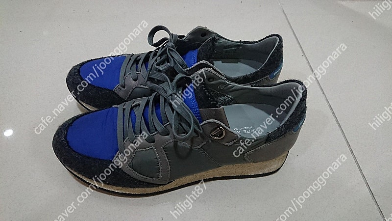 필립모델 남성스니커즈 260(EU 41)입니다. Made in Italy 제품이며 블루와 그레이 조합이 아주 멋집니다. 착용 횟수 10회 미만으로 약간의 사용감 있어 저렴하게 내놓습니다. 끈 조절하면 255도 가능한 것으로 보입니다. (본인이 255,260 둘 다 신음) 직거래는 광화문,서울시청,서대문역 인근에서 주말 포함 가능합니다. 택배거래시 택배비는 별도입니다.