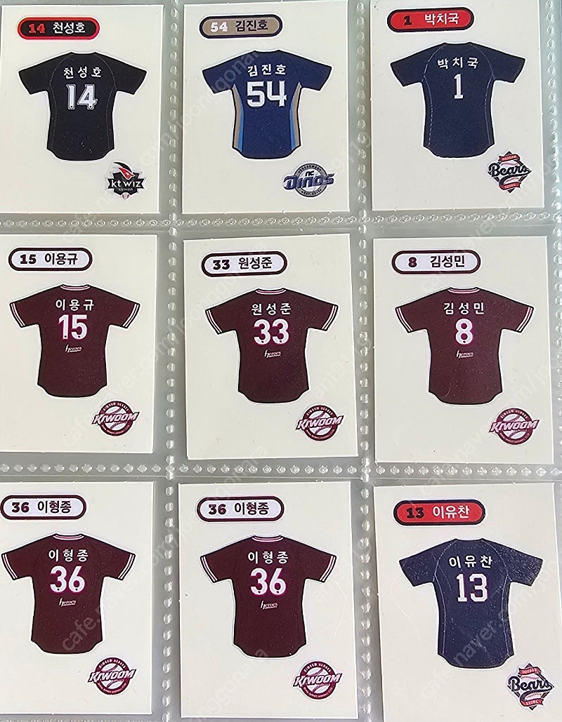 📢 제목에 "제조사/ 브랜드 명"과 "상품명”를 넣어 작성하면, 보다 빠른 판매가 가능합니다! 📢 게시글 작성 시 배송 방법에 “직거래”와 “내 위치” 설정할 경우, 보다 빠른 판매가 가능합니다! KBO 띠부씰 입니다 엘지 유니폼 띠부씰과 교환 및 구매 요청 반택 가능 보유 띠부씰 기아 : 나성범 키움 : 박수종, 김윤하, 국대 이주형, 국대 김휘집, 김태진 SSG : 김민식, 조형우, 이지영, 최정 한화 : 이도윤 KT : 천성호, 국대 박영현, 손동현 NC : 박건우, 류진욱, 권희동, 김진호 삼성 : 블레오 두산 : 최승용, 곽빈, 이병헌 보유 유니폼 띠부실 NC : 김진호 두산 : 박치국, 이유찬 KT : 천성호 키움 : 이용규, 이형종, 원성준, 김성민 원하는 띠부씰 백승현, 유영찬, 이우찬, 함덕주, 문성주, 국대 문보경, 국대 홍창기 🚨회원님의 거래 게시글을 노린 중고나라 운영진 사칭 피싱 사이트를 주의하세요🚨