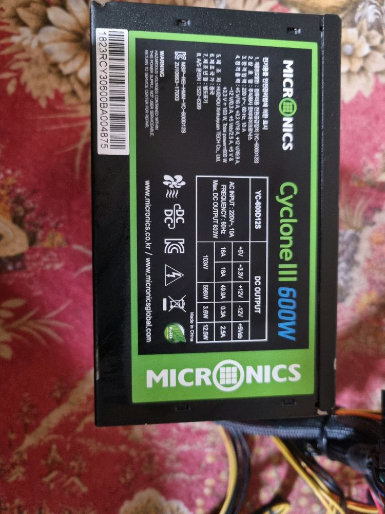 개인정보(거래정보)를 주고받는 행위는 사기에 노출될 수 있으므로 즉시 중고나라로 신고해 주세요마이크로닉스 Cyclone III 600W 파워입니다 - 정격 600W - ATX 파워 - 80PLUS 스탠다드 인증 안정적인 전압과 저소음 쿨링 팬이 특징입니다 사용하던거데 내놓습니다. 작동완벽하게 작동해요.