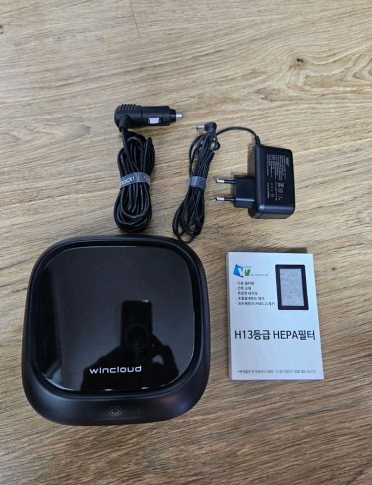 윈클라우드 차량용 공기청정기입니다 구성품은 다음과 같아요: - 본체 - 차량용 충전기 - 전원 어댑터 - H13 등급 HEPA 필터(새상품) .필터 갈아끼운지 얼마안됩니다 .새필터도 추가로 무료 증정드립니다 .사용감있어서 저렴하게 판매합니다 .블랙 색상으로 차량 내부에 잘 어울립니다~