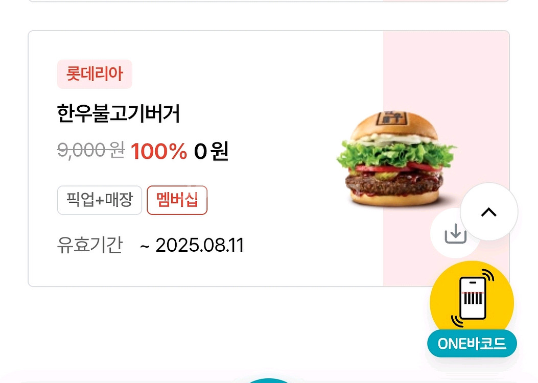 롯데라아 한우불고기버거 단품 쿠폰입니다 9000 -> 7600 판매해요