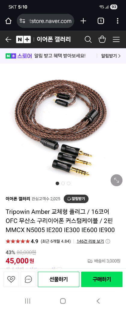 Tripowin Amber 교체형 플러그 16코어 이어폰 케이블입니다 실사용 2회로 새거나 다름없습니다. 다른 케이블사서 팝니다.
