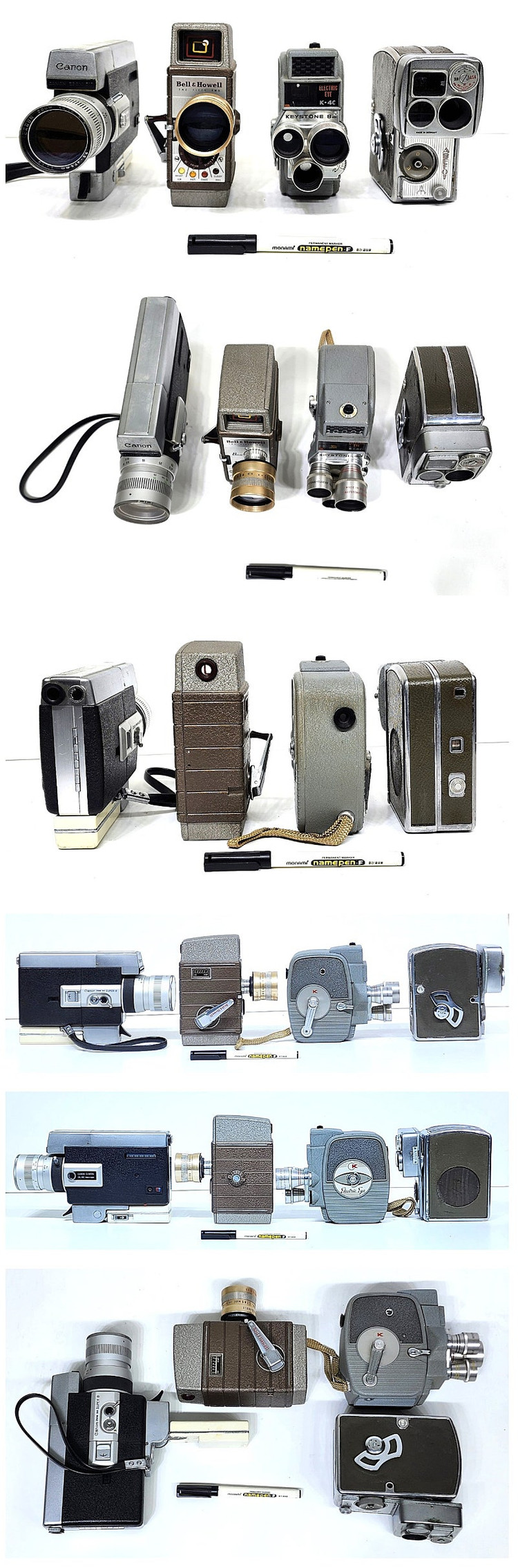 오래전 미국 앤틱샾에서 구입했던 앤틱 무비 카메라 4개 일괄로만 정리합니다. 100년이 다 되어가는 (정확하게는 모름) 카메라여서 사용감은 있지만 파손된 부분 없이 상태 양호합니다. 단순 장식용으로 정리하니 카메라의 상세 정보나 기능에 대한 내용은 전혀 답할수 없습니다. 카메라들의 사이즈는 네임펜 크기로 참고하시고 상세 사이즈 어떻게 되냐, 생산년도가 어떻게 되냐 라는 질문 받지 않습니다. 번거러워서 환불이나 교환 불가하니 사진 속 상세 외관 상태 확인 후 구입 바랍니다. 직거래는 은평구 역말로69 GS편의점 앞이고 택배는 착불에 환불 불가와 면책에 동의하는 분만 신청가능합니다. 가격 네고 불가이며 근무중이니 꼭 문자로만 연락 바랍니다. % 87구일 6사9구