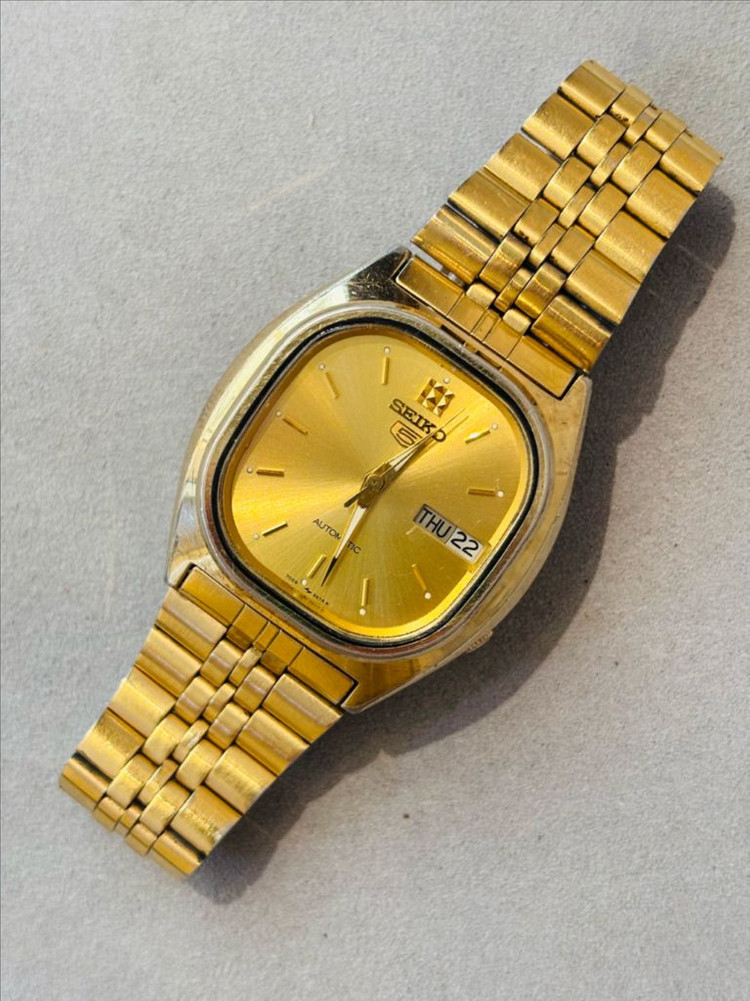 세이코5 빈티지 오토매틱 시계 입니다. 오버홀 완료하였습니다 케이스 생활기스 있습니다 글라스 교체하였습니다 손목 18cm 착용샷 참고하세요 손목둘레 최대 17.5cm 까지 가능합니다 용두1단 날짜조정, 용두2단 시간조절입니다 요일조정은 독특하게 용두를 눌러 조정합니다 빈티지 기계식 시계이므로 일오차가 있을수 있습니다. 또한 용두를 뽑을때 초침이 멈추는 핵기능이 없습니다 무보정 사진이므로 상세 사진을 확인바랍니다. Made in Japan Size : 35.5(용두제외), 러그 19.5 Color : 골드 - 모든 시계는 제가 직접 깨끗이 청소하고, 24시간 이상 동작 확인 및 기본적인 정비를 하여 이상이 없는 제품만을 판매합니다. - 빈티지 제품은 특성상 사용감, 스크래치 등이 존재하며 이러한 경우 사진과 함께 최대한 자세히 설명을 하도록 노력하고 있습니다. - 새상품이 아니므로 초기 불량 이외에는 A/S, 교환, 환불이 어려우니 궁금한 점은 톡으로 문의주시고 구매바랍니다.