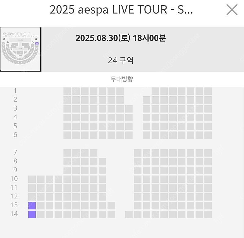 📢 제목에 "제조사/ 브랜드 명"과 "티켓명(ex. 스타벅스 아메리카노 Tall) ”을 넣어 작성하면, 보다 빠른 판매가 가능합니다! 📢 게시글 작성 시 배송 방법에 “직거래”와 “내 위치” 설정할 경우, 보다 빠른 판매가 가능합니다! 📢 내가 가진 커피, 편의점 e쿠폰을 에서 간편하고 빠르게 판매가 가능합니다! 2일 이내 판매금을 정산 받아보세요. 2025년 8월 30일 (토) 18시 에스파 콘서트 티켓입니다. 24구역 13,14번 앞,뒤 좌석 입니다. 한장당 가격입니다. 🚨회원님의 거래 게시글을 노린 중고나라 운영진 사칭 피싱 사이트를 주의하세요🚨