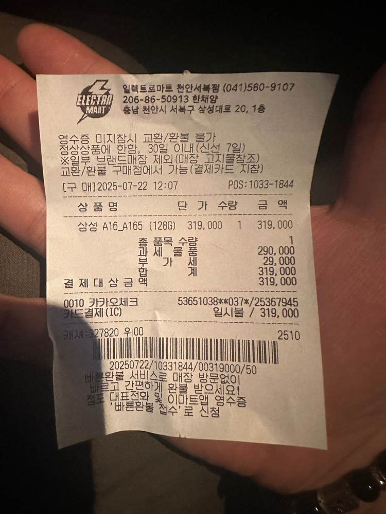 삼성 갤럭시 A16 블랙 128GB 자급제 판매합니다. 영수증 보시면 알겠지만 7월 22일자로 구매한 새상품 입니다. 업무용 휴대폰으로 사용하려다 필요가 없어져서 엄청 저렴하게 판매합니다. 포장박스는 조금 지저분하게 뜯겨져있고 원하시면 사진 추가로 보내드립니다. 거래는 직거래(천안 두정동 신대초등학교 앞) 그리고 편의점 택배(3000원 추가) 발송 가능합니다. 많은 관심 부탁드립니다.