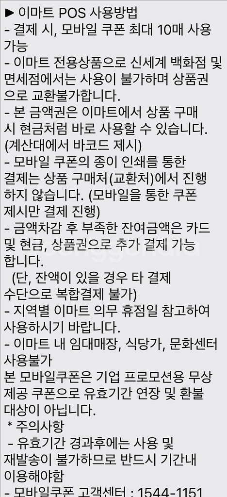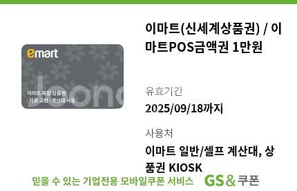 이마트 금액권 1만원권 x3장 유효기간, 유의사항 사진 참고해주세요 총 30000원 -> 25000원 급처 판매합니다 상품권 거래 특성상 전송 후 환불 불가능합니다 - 이마트 KIOSK 사용처: 이마트 상품권 교환 KIOSK (백화점 교환 불가) - 이마트 POS 사용처: 이마트/트레이더스 전 지점, 노브랜드 직영점, 이마트에브리데이 직영점 (단 이마트 부천점, 안양점, 이마트24, 노브랜드/이마트에브리데이 일부 매장 제외)