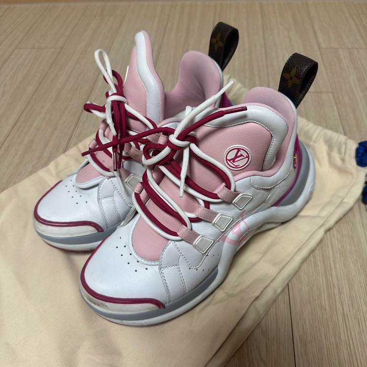 루이비통 아치라이트 37 정품입니다. 가품 시 보장해드려요!!!(인보이스 영수증x, 품질보증서만 보유) 선물 받은 제품 10회미만 착용, 사이즈가 작아 판매합니다. 구성품 : 더스트백 오른발 뒷꿈치 리벳 탈락되어 수선 맡겨보았으나 불가 안내 받아 본드로 고정 상태이며 신는데에는 문제 없습니다. ♥️ 판매가 450,000원 ♥️ 교환/환불 불가🙅🏻♀️ 무료 택배 가능!! 연락주세요💕