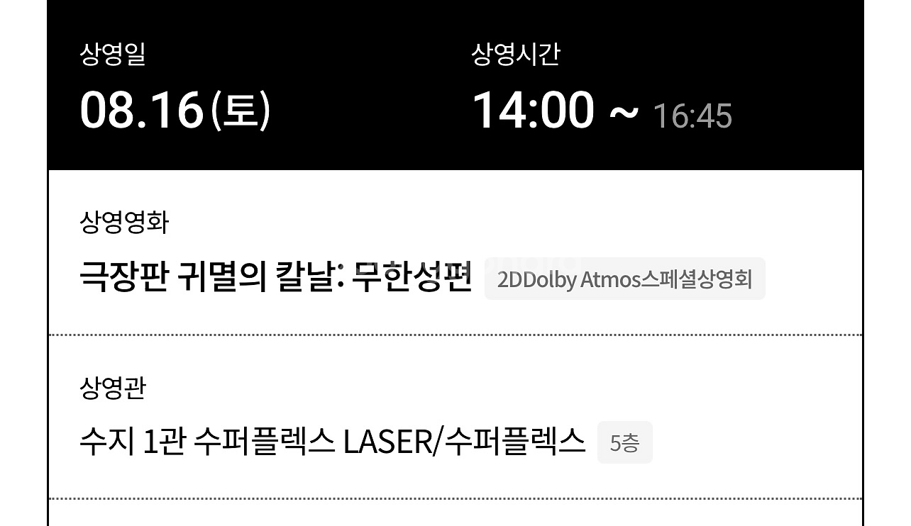 8월 16일 토요일 2시 영화 티켓 2장 판매합니다 - 영화: 극장판 귀멸의 칼날: 무한성편 - 상영관: 수지 1관 수퍼플렉스 LASER/수퍼플렉스 5층 - 좌석: J열 2연석 중앙입니다. 쪽지주시면 위치 정확히 알려드릴게요 당연히 특전 받으실 수 있습니다