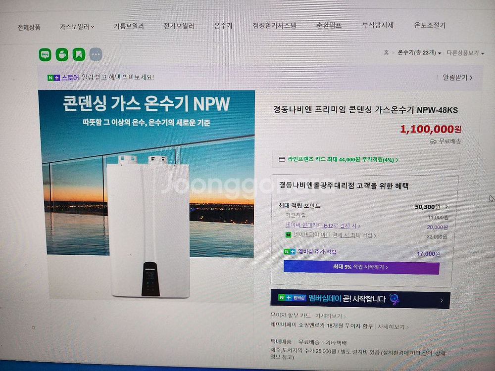나비엔 보일러 가스 온수기 NPW-38K6-LNG 모델입니다 - LNG(도시가스)용 - 난방출력: 38kW, 온수출력: 43kW - 자동온도조절, 동파방지 기능 있어요 - 크기: 440x780x255mm 용량큰 온스전용입니더 총4대있어요 2019년 1월 설치 제픔입니다 상태는 괜찮습니다 가스호스 드리고 연통은 없어요 네고 문의 받아요 01065948050