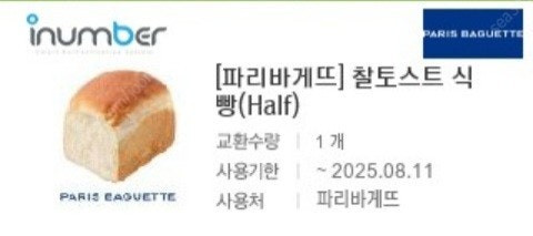 파리바게트(파리바게뜨) 2700원권식빵,35000원권 케이크 판매합니다.메뉴변경가능 위 동일상품입니다. 파리바게트 찰토스트식빵(Half) 2,700원권-2,300원에 판매합니다.~2025.08.11/2025.08.16/잔여2매 2700원 각 금액만큼 빵.음료 등 타제품으로 교환가능합니다. ##케이크35,000원권-29,000원에 판매.사진과 별개로 가격인상 있으므로 35000원만큼 변경가능합니다 ㅇ1ㅇ-2898-ㅇ344 문자주세요~ 입금(국민.토스.우리) 확인후 전송드리겠습니다. ###기한연장불가.모바일 특성상 발송 후에는 취소.환불 어렵습니다.