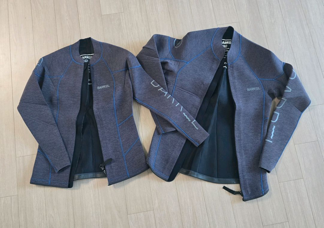배럴 네오프렌 자켓 슈트입니다 슈트 재질 특성상 쫀쫀하게 몸에 핏됩니다 네오프렌 소재로 보온성 좋아요 무엇보다 디자인이 이쁜데 작아져서..ㅠㅠ 남성용 - s사이즈 여성용 - s사이즈(팬츠도 s사이즈) 몇년전에 사놓고 한번 입고 보관만 했어요 일괄 판매해요