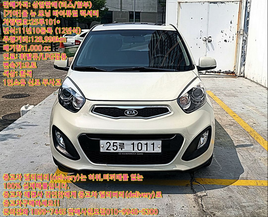 마음 편한 내차 사고 팔때 중고차 살까? 팔까? 지금 고민중이시라면! 중고차딜리버리 전문 1899-7445에서 해결하세요~~ 중고차 청정지대 인천광역시 중고차매매사업조합 회원상사 프로자동차매매상사 안심구매 공식추천차량,신차와 같은 중고차를 중고차 시장에서 가장 안전하고 투명하게 거래를 도와드리겠습니다. 빠르고 간편하게 안정적인 중고차가격 합리적인 중고차가격으로 저희에게 전화를 주시면 전문가의 신속하고 정확한 견적제공, 중고차 거래를 경험할 수 있습니다. 언제든지 연락 주시면 친절하고 전문적인 상담을 받으실 수 있습니다. 최고급(수입차,국산차) 중고차 부담없이 구매도와드립니다. (개인회생,개인파산,신용불량이신분도 상담후 진행가능) 이전비 0원, 차값+자동차보험료+여유자금까지 무보증 최장60개월분할납입가능 좋은차 이전비 전혀 부담하지마시고 차가격만 매월 저렴하게 납입하시고 3년만 타시다가 직거래로 판매하시면 큰 손해 안나게 도와드립니다! [기아] 올뉴모닝 주인을 찾습니다. (개인회생,개인파산,신용불량인 분들도 상담후 진행 가능합니다.)중고차리스,중고차매매,중고차할부, 중고차거래, 폐차상담,신차상담, 자동차보험상담 판매가격: 상담판매(리스/할부) [기아]올 뉴 모닝 바이퓨얼 럭셔리 차량번호:25루101* 년식;11년10등록 (12년식) 주행거리;128,998km 배기량:1,000 cc 연료: 휘발유/LPG겸용 변속기;오토 색상: 흰색 1인소유 신조 무사고 (460만원) 2012년식 2011년등록 오토 흰색 무사고 차량입니다..자동접이식 사이드미러,ABS, CDP,가죽씨트,운전석,조수석 열선씨트,후방감지기,풀오토 좌우독립식 전자동 에어컨,가죽핸들,핸들리모컨,커튼에어백,전동썬루프,ECM룸미러,하이패스,스마트키,스타트버튼키,히팅핸들,알루미늄휠,등이 장착된 풀 옵션 (장착옵션 계약시 확인필!!) 최고의 컨디션을 유지하고 있는 주행거리 짧은 특A급 차량입니다.지금 결정하시고 바로 전화 주시면 이 가격, 단 한번 파격 조건으로 가능합니다.빨리 전화 주시고 예약