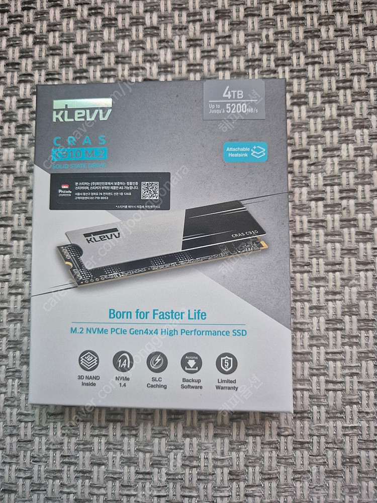 KLEVV CRAS C910 M2 NVMe SSD 4TB 미개봉 새제품 팝니다 - NVMe PCIE Gen4x4 - 4TB 저장 용량 - M.2 2280 폼팩터 - 5년 무상 워런티 8월 1일 로젠택배로 받은 제품입니다 박스 및 씰 상태 좋으며 미개봉 새제품인 만큼 개봉 후 반품은 불가합니다 직거래 인천 송림동 동산휴먼시아2단지 또는 택배착불(선불시4000원)로 거래가능합니다0I0-7I74-I255 가격 : 25만원