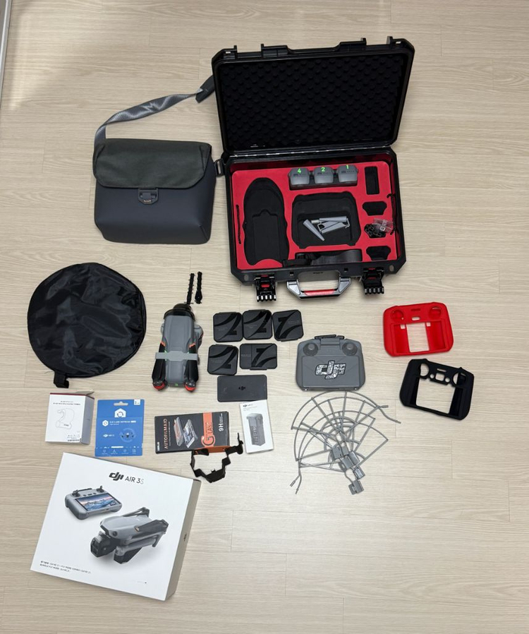 dji air3s + 동글2 +추가 배터리 (총4개)+ 사진에 보이는 악세사리 모두 포함하여 팝니다 2년 케어는 한번도 사용 안했습니다 직거래 분당, 용인, 수원, 동탄 쪽에서 가능 합니다