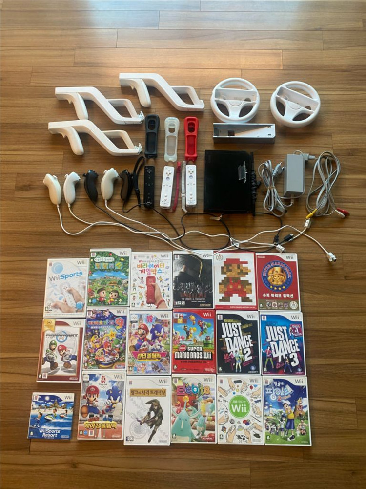 닌텐도 Wii 풀세트 판매합니다. 본체, 컨트롤러 여러 개, 눈차크, 핸들, 센서 바 모두 포함입니다. 게임은 Wii Sports, 마리오 카트, Just Dance 등 다양하게 있습니다. 전체적으로 사용감은 있지만, 작동 잘 됩니다 리모컨이나 눈차크 시디 한두개 정도는 안될수도 있을꺼 같네요 다될수도 있구요 여러개 있으니 뭐 가만하고 구매부탁드려요 그로인힌 반품은 없구요 적당한 가격에 제안주세요