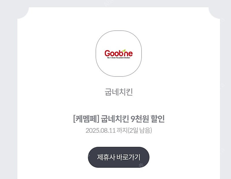 📢 제목에 "제조사/ 브랜드 명"과 "티켓명(ex. 스타벅스 아메리카노 Tall) ”을 넣어 작성하면, 보다 빠른 판매가 가능합니다! 📢 게시글 작성 시 배송 방법에 “직거래”와 “내 위치” 설정할 경우, 보다 빠른 판매가 가능합니다! 📢 내가 가진 커피, 편의점 e쿠폰을 <J쿠폰>에서 간편하고 빠르게 판매가 가능합니다! 2일 이내 판매금을 정산 받아보세요. 2천원에 판매합니다 1장 있어요 안심번호 문자나 채팅주세요 [이용방법] • 굽네치킨 모든 메뉴 9천원 할인쿠폰(굽네치킨 앱/홈페이지에서 1.7만원 이상 주문 시 적용) • 쿠폰 사용방법 : 굽네치킨 앱/홈페이지 접속(로그인 필요) → e교환권/ 금액권 사용하기 버튼을 클릭 → e금액권 번호 16자리를 입력 후 등록 → 주문을 원하는 주소를 입력 후 매장 선택 → 원하는 메뉴를 장바구니에 담기 (1.7만원 이상) → 결제하기에서 kt 금액권 선택 → 차액을 결제 [유의사항] • 쿠폰 유효기간은 8월 5일(화)부터 8월 11일(월)일까지이며, 유효기간 연장 불가 • 굽네치킨 앱/홈페이지에서 주문 시 이용 가능 • 사용 불가매장을 확인 후 쿠폰 사용 요망 • 주문은 매장 운영시간 PM 12시 ~ PM 12시에 가능(일부 가맹점 사정에 따라 달라질 수 있음) • 배달주문 시 배달비가 추가 발생할 수 있으며, 배달비는 주문하실 매장으로 문의 가능 • 일부 매장에서 제품 판매 가격이 다를 수 있음 • 매장 사정에 따라 온라인주문이 지연 또는 불가 할 수 있음 (피크타임, 재고부족, 배달 사고 등) • 매장 사정에 따라 매장에서 사용하는 것이 제한될 수 있음 • 기타 다른 이벤트, 할인 혜택, 굽네 멤버십 쿠폰 중복 사용불가 • 본 디지털 상품권은 현금과 교환되지 않음 • 쿠폰 발급 후 미사용 시에도 취소 및 환불 불가 🚨회원님의 거래 게시글을 노린 중고나라 운영진 사칭 피싱 사이트를 주의하세요🚨