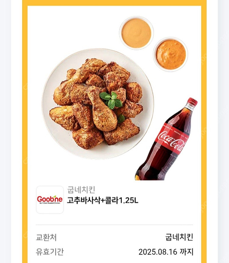 📢 제목에 "제조사/ 브랜드 명"과 "티켓명(ex. 스타벅스 아메리카노 Tall) ”을 넣어 작성하면, 보다 빠른 판매가 가능합니다! 📢 게시글 작성 시 배송 방법에 “직거래”와 “내 위치” 설정할 경우, 보다 빠른 판매가 가능합니다! 📢 내가 가진 커피, 편의점 e쿠폰을 <J쿠폰>에서 간편하고 빠르게 판매가 가능합니다! 2일 이내 판매금을 정산 받아보세요. 굽네치킨 고추바사삭+콜라1.25L 2025.08.16까지 말복인 오늘 저렴하게 치킨 드세요 22,900원 -> 15,500원 에눌문의. 찔러보기. 계좌먹튀사절 안심번호로 문자주세요 🚨회원님의 거래 게시글을 노린 중고나라 운영진 사칭 피싱 사이트를 주의하세요🚨