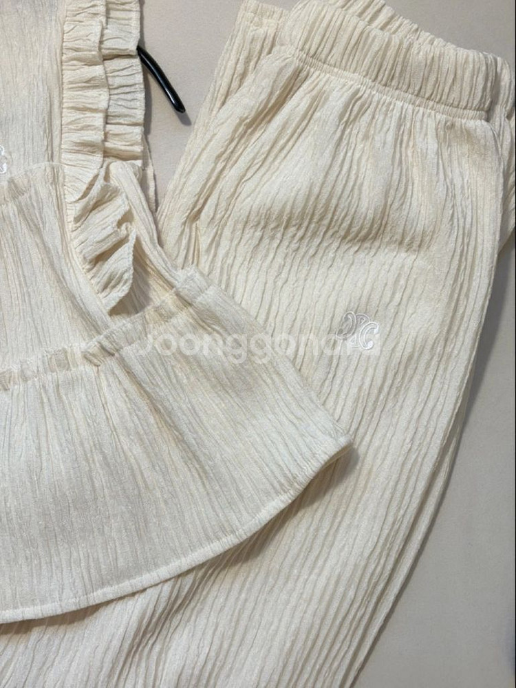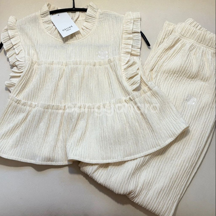 셀린느 트리오페 로고 프릴 상하의 세트입니다 - 브랜드: 셀린느 - 사이즈: Free (넉넉한 스타일) - 색상: 아이보리 - 재질: 부드러운 코튼 혼방 55반 사이즈까지 가능합니다 입으면 샤랄라해요^^ 뱃살가려주며 잘늘어나고 시원합니다 편하게 입기 좋은 스타일이에요 교환X반품X