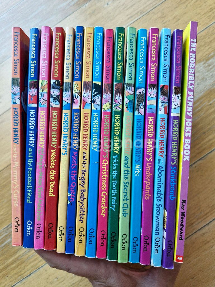 잠수네에서 유명한 호리드 헨리 챕터북 입니다 헨리는 자타공이 말썽쟁이초등학생입니다 여간해서는 숙제하는법이 없고 건강한 음식을 극협하며 상상력이 풍부하고 동생을 괴롭힘을 즐기며 내가 왕이면 ~~할텐데 와 같은 상상을 하는 주인공 입니다 에니메이션까지 나와있어 책과 함께 영상으로도 보여주시면 아주 좋습니다 책은 깨끗하나 갱지 챕터 특유의 변색은 있을수 있습니다 총 16권(조크북포함) 정품입니다 음원보유 직거래 구서동 롯데캐슬 택배 착불