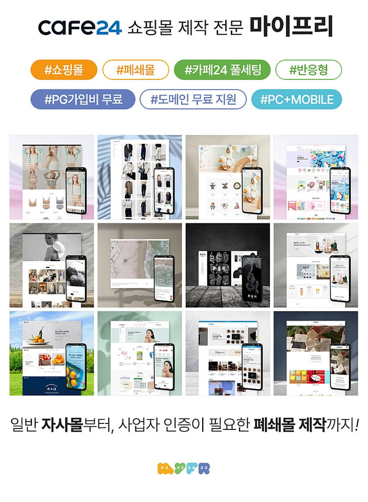 안녕하세요! 카페24 쇼핑몰 제작 전문 14년차 디자이너 마이프리입니다. 쇼핑몰 제작에 많은시간 쏟지 마세요. 마이프리에 맡기시면 알아서~ 해드립니다 :) 바로 오픈 가능하도록 세팅해드려요 풀세팅하고 상품등록만 하세요! 📌카페24 기본 서비스 목록 ✔ 도메인 연결 / SSL 보안 인증서 설정 (도메인 1년 무료제공 및 SSL 보안인증서 설정) ✔ 네이버 · 구글 웹마스터도구 세팅 (검색엔진최적화 SEO, rss+사이트맵 포함) ✔ 네이버 · 구글 애널리틱스 세팅 (방문자 조회 및 유입 통계 태그삽입) ✔ 파비콘 등록 (웹페이지 탭에 보여지는 작은아이콘) ✔ 홈추가 아이콘 등록 (모바일로 홈화면 추가 시 보여지는 아이콘) ✔ 카톡 썸네일 등록 (카톡으로 URL전송시 보여지는 이미지 및 문구) ✔ 상품 카테고리 및 게시판 세팅 (카테고리 개수 제한 없음) ✔ 메인 슬라이드 및 배너 디자인 세팅 (원하시는 느낌으로 제작해드립니다!) ✔ 회원가입 적립금 및 기본적립금 세팅 ✔ 배송정보 및 고객센터등 필수정보 세팅 ✔ 은행정보 및 무통장 입금 계좌 세팅 ✔ 로고가 없을 경우 텍스트 로고 제공 (웹에서 사용가능한 용도로 깔끔하게 제작) ✔ 하단 인스타그램 피드 연동 (메인 하단에 보여지는 인스타그램 피드 노출) ✔ SNS 간편 로그인(네이버+카카오) 연동 (1초 로그인) ✔ 네이버페이 연동 ✔ 카톡상담 및 톡톡상담 연동 + sns 아이콘 연동 ✔ 카페24 운영시 도움이 되는 매뉴얼 제공 (상품등록, 카테고리변경, 이미지 변경, 팝업노출 등 기본적으로 운영에 필요한 매뉴얼) 이외 스마트스토어연동, 유튜브쇼핑연동, 페북픽셀 등 원하시면 무료 등록해드립니다. + 추가로 작업 가능한 항목으로는 카카오페이(주문형) 연동 작업도 가능합니다. ✨ 제작기간 보통 1주 ~ 2주일정도소요되십니다. 원하시는 기간이 있으신 경우 미리 말씀주시면 최대한 맞춰드리고 있습니다 :) 📒 메뉴얼 제공 제작 이후, 대표님께서 직접 운영하실 수 있도록 카페24 운영 매뉴얼과 이미지 변경 매뉴얼 등 전달드려 혼자서 충분이 운영이 가능합니다🧡 ❤️ 상담문의 ❤️ 카카오톡ID : myfree1017 상담가능(업무)시간🌸 평일 am10:00 ~ pm6:00 📞연락처 : 010 8242 1017 자세한 상담을 위해서 전화보다는 카톡으로 먼저 연락부탁드리겠습니다. 💙 포트폴리오 💙 아래 주소 클릭 하시면 보실 수 있습니다. 👇👇👇👇👇👇 http://kwy-portfolio.co.kr 원하시는 카테고리 선택 후 보시면 더욱 편리합니다! (해당 썸네일 클릭하시면 상세페이지로 자세히 보실 수 있습니다.) ❤️ 상담문의 ❤️ 카카오톡ID : myfree1017 상담가능(업무)시간🌸 평일 am10:00 ~ pm6:00 📞연락처 : 010 8242 1017 자세한 상담을 위해서 전화보다는 카톡으로 먼저 연락부탁드리겠습니다. 더 많은 작업물을 보시려면 아래 포트폴리오를 클릭해주세요! 💙 포트폴리오 💙 아래 주소 클릭 하시면 보실 수 있습니다. 👇👇👇👇👇👇 http://kwy-portfolio.co.kr 원하시는 카테고리 선택 후 보시면 더욱 편리합니다! (해당 썸네일 클릭하시면 상세페이지로 자세히 보실 수 있습니다.)
